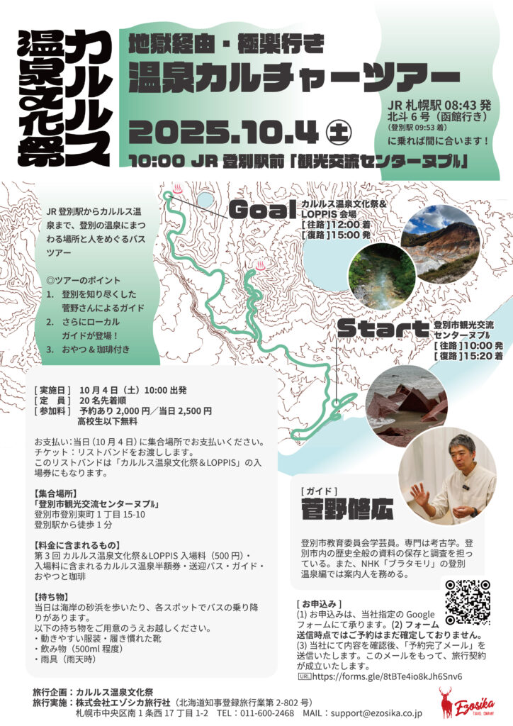 JR 登別駅からカルルス温泉まで、登別の温泉にまつわる場所と人をめぐるバスツアーです。