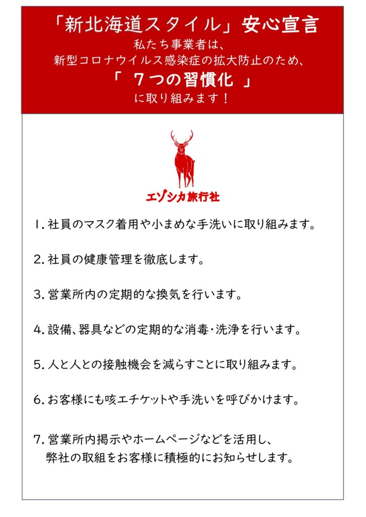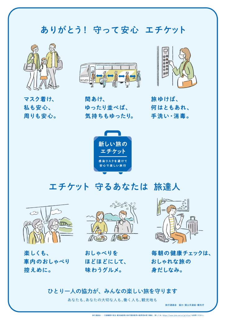 新型コロナウイルス感染防止のために「旅行業における新型コロナウイルス対応ガイドライン」および新型インフルエンザ等対策特別措置法による緊急事態宣言に基づき、感染防止と安全確保の取り組みを実施しております。